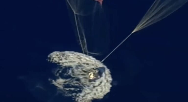 O procedimento começou ainda em grande altitude, quando os paraquedas de estabilização foram acionados a cerca de 6,7 quilômetros da superfície. A função deles é simples, mas essencial: reduzir a velocidade inicial e manter a cápsula alinhada para a descida. Pouco depois, já em uma altura menor, os três paraquedas principais entraram em ação, diminuindo a velocidade para aproximadamente 32 km/h — patamar considerado seguro para o impacto no mar.