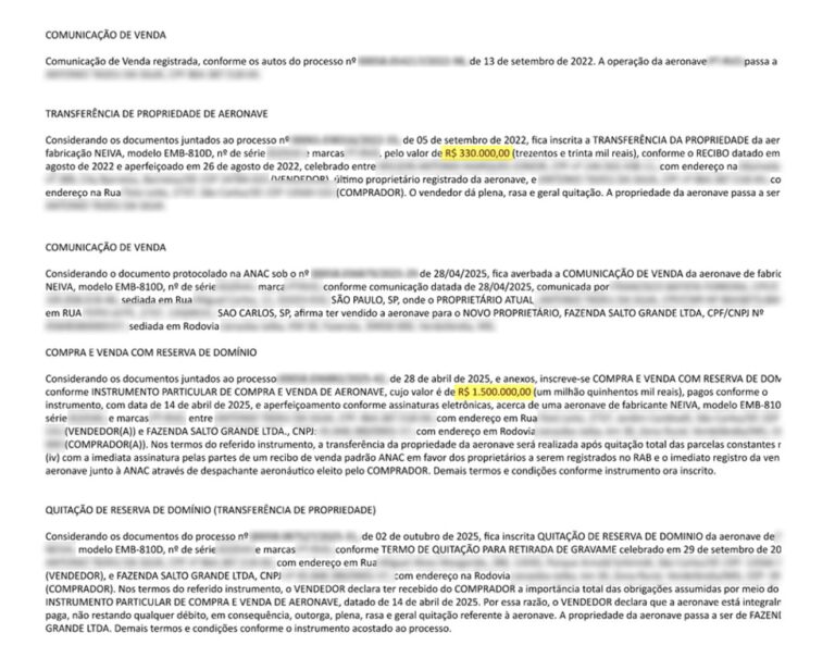 O valor pago pelo avião chama atenção por ser significativamente superior ao da negociação anterior. Três anos antes, o mesmo modelo havia sido vendido por R$ 330 mil, uma diferença que representa uma valorização de mais de quatro vezes no período.